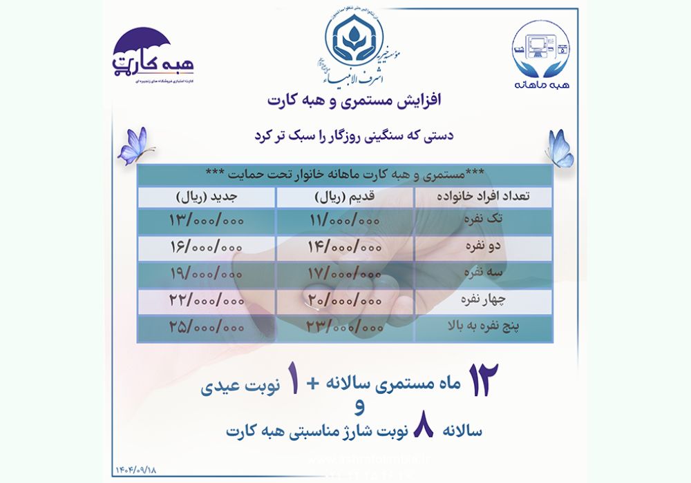 مبلغ مستمری ماهانه و شارژ هبه کارت(ارزاق فروشگاهی) را افزایش داد.
