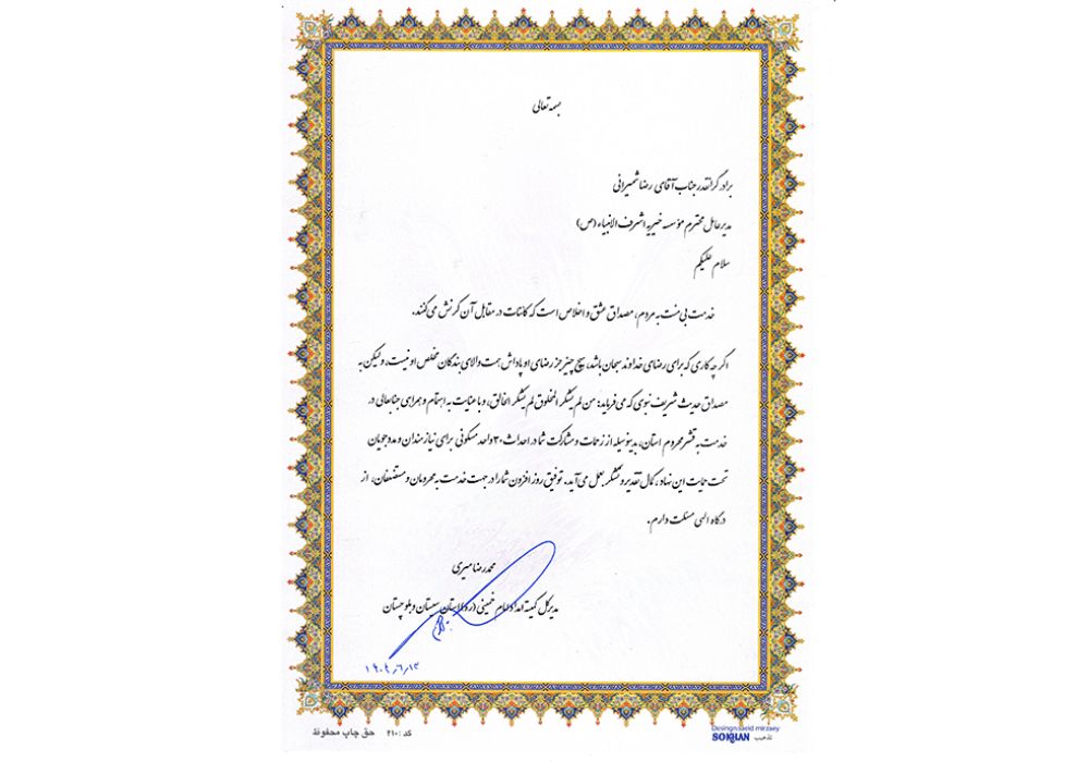 6 آبان ۱۴۰۴ تقدیر نامه مدیر کل کمیته امداد استان سیستان و بلوچستان تقدیر نامه مدیر کل کمیته امداد استان سیستان و بلوچستان ارسال شده 10 ساعت پیش